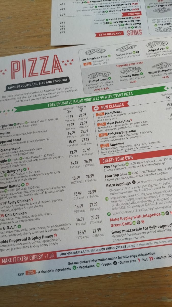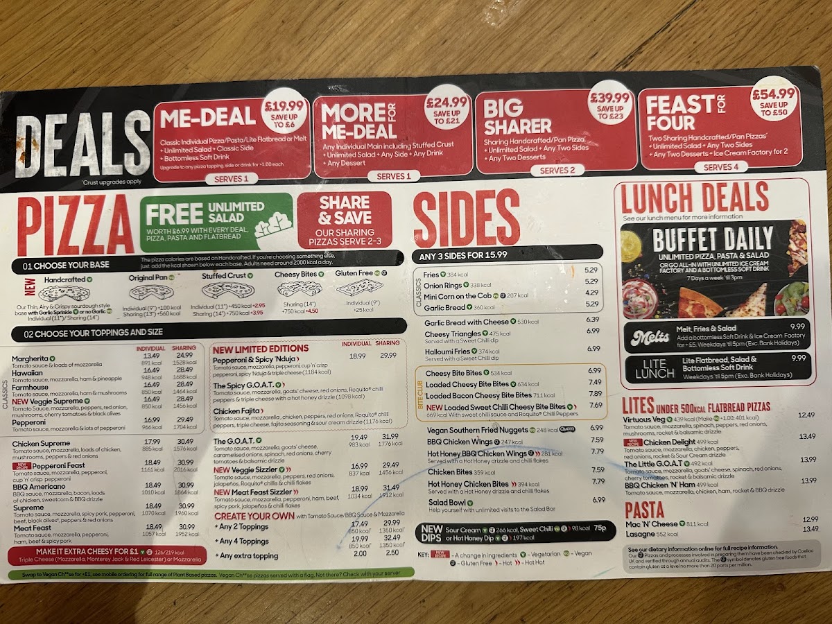 Here, you can enjoy everything from hearty pan pizzas and popular sharing options to fresh unlimited salads that provide a lighter balance. The menu also includes a range of snacks and sides like onion rings and tortilla chips, alongside comforting dessert choices like ice cream topped with chocolate chips or cookies — making it easy to round off your meal with something sweet.